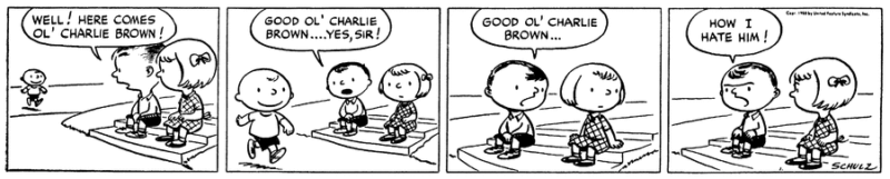 記念すべき第1話で、彼は向かって歩いてくるチャーリー・ブラウンに、いきなり「きみがきらい!」(HOW I HATE HIM!) と言い放ちます。