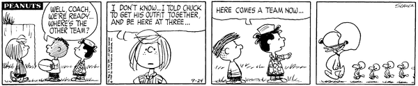 しかし、現実は非情。チャーリー・ブラウンのチームのあまりの弱さに愛想を尽かしたのか、ペパーミント・パティはわずか6日後には自分たちのチームを作るために去ってしまいます。