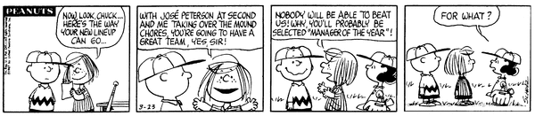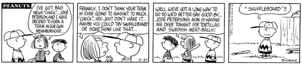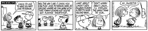 1967年3月21日のエピソードでは、ペパーミント パティがホセを連れてチャーリー・ブラウンの野球チームに加入します。パティとしては「凄腕の助っ人を連れてきたわよ!」という自信満々の推薦だったわけです。