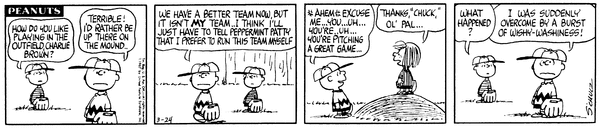 ついにペパーミント・パティはピッチャーの座(チャーリー・ブラウンの唯一の居場所)まで奪うと宣言。