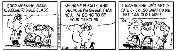 兄のチャーリー・ブラウンから日曜学校(バイブル・スクール)の講師の依頼を伝えられたサリー。自分に教えられる人がいるのかと驚くことで、サリー自身の知識のなさを自虐的に(あるいは無邪気に)強調しているが印象的ですね!