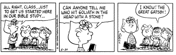 聖書の有名な「ダビデとゴリアテ」の話を質問したサリーに対し、生徒のラリーが自信満々にフィッツジェラルドの小説の主人公『グレート・ギャツビー』の名前を挙げます