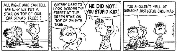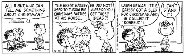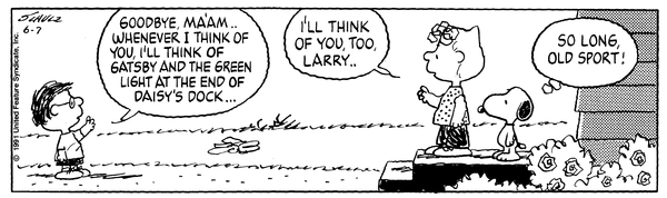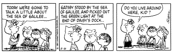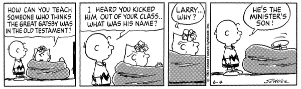 それを見守るスヌーピーが心の中でそのセリフをリピートしており、サリーの日曜学校教師としての挑戦が、結局ギャツビー一色に染まって終わりました。