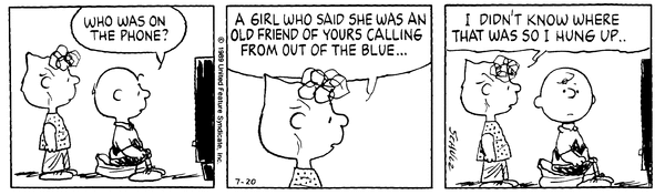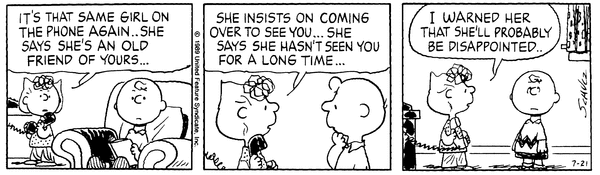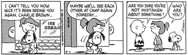 - 彼女はスヌーピー(をチャーリー・ブラウンだと思っている)に対して、かつてキャンプで一緒に過ごした思い出を語りかけます。しかし、読者にとってもチャーリー・ブラウンにとっても、そのようなエピソードは過去の作中に一度も登場していません。