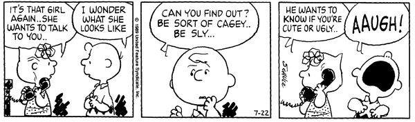 「さりげなく(Sly)」という頼みを台無しにするサリーの直球すぎる質問。チャーリー・ブラウンの叫び(AAUGH!)が響きます。会う前から、もう終わってる感じがしますよね。
