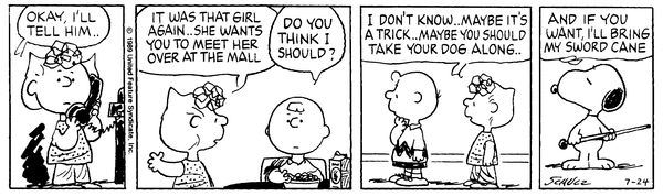 物語は、妹のサリーがチャーリー・ブラウンに「ショッピングモールで会いたいという友達から電話があったよ」と伝えたことから始まります。