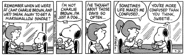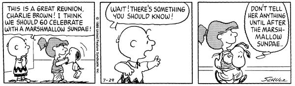 スヌーピー「マシュマロ・サンデーを食べるまでは、彼女に何も言わないでくれよ…」