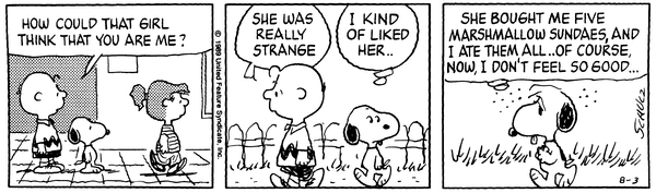 - 現れた少女は、なんとスヌーピーをチャーリー・ブラウンだと思い込み、そのまま彼(犬)を連れてマシュマロ・サンデーを食べに行ってしまいます。