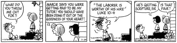1986年7月29日のストリップで、彼は例の報酬に関する言葉を「ルカによる福音書10章4節」と言っていますが、実はこれ、正しくは「10章7節」なんです。
