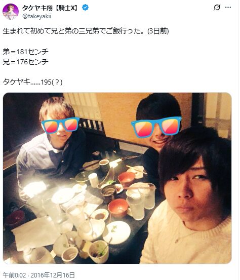 実はタケヤキ翔さんにはご兄弟がいて、弟さんの身長は181cmの長身で、お兄様も176cmと長身らしいですね!