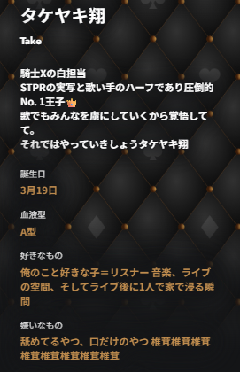項目別!タケヤキ翔さんの情報 早わかりデータブック