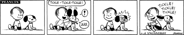 スヌーピーは悪戯好きで、ライナスがいつも可哀そうな目にあいますが、おそらくライナスの寛容な心で許されています!