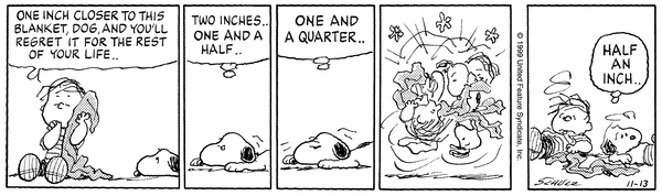 1999年11月13日がライナスの安心毛布の最後の出番でしたが、最後の最後までスヌーピーとライナスの毛布争いが続きました。