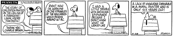 THE STORY OF CIVILIZATION PAINTED ON THE CEILING OF A DOGHOUSE! LINUS, YOU'RE FANTASTIC!