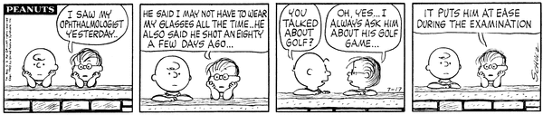 I SAW MY OPHTHALMOLOGIST YESTERDAY.. 昨日、眼科の先生のところへ行ってきたんだ.. HE SAID I MAY NOT HAVE TO WEAR MY GLASSES ALL THE TIME.. HE ALSO SAID HE SHOT AN EIGHTY A FEW DAYS AGO... ずっと眼鏡をかけていなくてもいいかもしれないって。それと、数日前にゴルフで「80」を出したって言ってたよ... YOU TALKED ABOUT GOLF? ゴルフの話をしたの? OH, YES... I ALWAYS ASK HIM ABOUT HIS GOLF GAME... ああ、そうだよ... いつも先生にゴルフの調子を聞くようにしてるんだ... IT PUTS HIM AT EASE DURING THE EXAMINATION そうすると、診察中に先生の緊張がほぐれるからね。