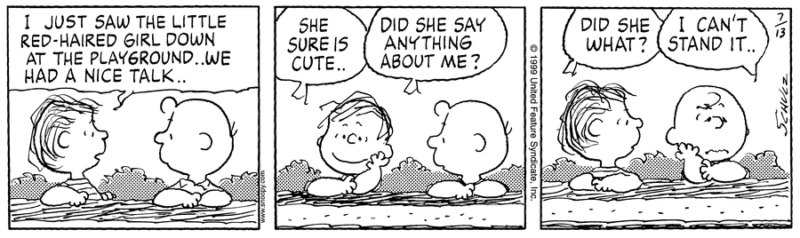 I JUST SAW THE LITTLE RED-HAIRED GIRL DOWN AT THE PLAYGROUND.. WE HAD A NICE TALK.. さっき遊び場で「赤毛の女の子」に会ったよ.. 楽しくお喋りしたんだ.. SHE SURE IS CUTE.. 彼女、本当に可愛いね.. DID SHE SAY ANYTHING ABOUT ME? 彼女、僕のこと何か言ってた? DID SHE WHAT? 彼女が何をだって? I CAN'T STAND IT.. ああ、もう耐えられない..
