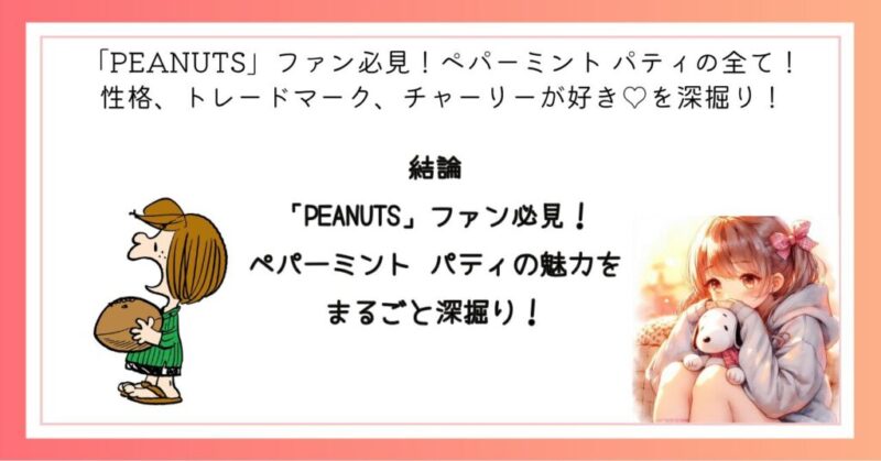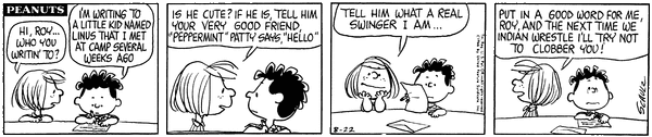 HI, ROY... WHO YOU WRITIN' TO? やあ、ロイ... 誰に手紙を書いてるんだい? I'M WRITING TO A LITTLE KID NAMED LINUS THAT I MET AT CAMP SEVERAL WEEKS AGO 数週間前にキャンプで知り合った、ライナスっていう子に書いてるんだ。 IS HE CUTE? IF HE IS, TELL HIM YOUR VERY GOOD FRIEND, "PEPPERMINT" PATTY SAYS, "HELLO" その子、可愛いの? もしそうなら、あんたの親友の「ペパーミント」パティが「よろしく」って言ってたって伝えなよ。 TELL HIM WHAT A REAL SWINGER I AM.. あたしがいかにイケてる(流行に敏感な)奴かってことも教えてやりな... PUT IN A GOOD WORD FOR ME, ROY, AND THE NEXT TIME WE INDIAN WRESTLE I'LL TRY NOT TO CLOBBER YOU ロイ、あたしのことを良く言っておくれ。そうしてくれたら、次に腕相撲(インディアン・レスリング)する時は、あんたをボコボコにしないようにしてあげるから!