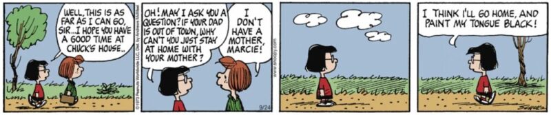 WELL, THIS IS AS FAR AS I CAN GO, SIR... I HOPE YOU HAVE A GOOD TIME AT CHUCK'S HOUSE.. さて、私はここまでです、先生(サー)... チャックの家で楽しんできてくださいね。 OH! MAY I ASK YOU A QUESTION? IF YOUR DAD IS OUT OF TOWN, WHY CAN'T YOU JUST STAY AT HOME WITH YOUR MOTHER? ああ、一つ質問してもいいですか? お父様が町を離れているなら、どうしてお母様と一緒に家にいないのですか? I DON'T HAVE A MOTHER, MARCIE! あたしには母親はいないんだよ、マーシー! I THINK I'LL GO HOME, AND PAINT MY TONGUE BLACK! 帰って、自分の舌を黒く塗ってしまいたい気分です!