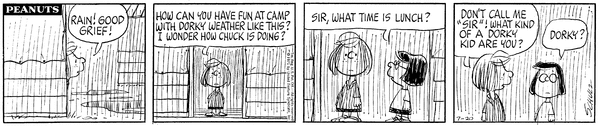 RAIN! GOOD GRIEF! 雨かよ! やれやれ! HOW CAN YOU HAVE FUN AT CAMP WITH DORKY WEATHER LIKE THIS? I WONDER HOW CHUCK IS DOING? こんな冴えない(ドォーキーな)天気のキャンプで、どうやって楽しめってんだい? チャック(チャーリー・ブラウン)はどうしてるかなぁ? SIR, WHAT TIME IS LUNCH? 先生(サー)、お昼ご飯は何時ですか? DON'T CALL ME "SIR"! WHAT KIND OF A DORKY KID ARE YOU? あたしを「サー」って呼ぶのはやめな! あんた一体どんな冴えない(ドォーキーな)ガキなんだい? DORKY? 冴えない(ドォーキー)?