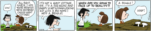 ALL RIGHT, MARCIE, I HOPE YOU'RE SATISFIED! YOU'VE DESTROYED CHUCK'S GUEST COTTAGE! よしきたマーシー、これで満足かい! あんた、チャックのゲスト用コテージを壊しちまったんだよ! WOW! わあ! IT'S NOT A GUEST COTTAGE, SIR, IT'S A DOG HOUSE! AND SNOOPY IS NOT A FUNNY-LOOKING KID WITH A BIG NOSE!! HE'S A BEAGLE! 先生(サー)、これはゲスト用コテージじゃありません、犬小屋です! それにスヌーピーは鼻の大きな変な顔をした子供じゃありません!! 彼はビーグル犬です! WHEN ARE YOU GOING TO FACE UP TO REALITY?! いつになったら現実を直視するんですか?! A BEAGLE? ビーグル? WOOF! ワン!