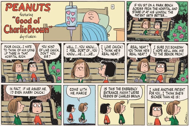 IF YOU SIT ON A PARK BENCH ACROSS FROM THE HOSPITAL AND STARE UP AT HIS WINDOW, THE PATIENT GETS BETTER... 病院の向かいにあるベンチに座って、彼の部屋の窓をじっと見つめていれば、患者は良くなるんだよ... POOR CHUCK.. I HATE TO THINK OF HIM LYING UP THERE IN THAT HOSPITAL ROOM かわいそうなチャック... あの病室で寝ている彼を思うとやりきれないよ。 YOU KIND OF LIKE CHUCK, DON'T YOU, SIR? 先生(サー)、チャックのことが結構お好きなんですね? WELL, I... YOU KNOW... I FEEL SORT OF.. YOU KNOW... HE.. I... HE.. まあ、あたしは... その... なんていうか... 彼が... あたしが... I LOVE CHUCK! I THINK HE'S REAL NEAT! 私はチャックが大好きです! 彼は本当に素敵だと思います! REAL NEAT? YOU THINK HE'S REAL NEAT? 本当に素敵? あんた、彼が本当に素敵だと思うのかい? I SURE DO! SOMEDAY I HOPE HE'LL ASK ME TO THE SENIOR PROM! もちろんです! いつかシニア・プロム(卒業ダンスパーティー)に誘ってほしいくらいです! IN FACT, IF HE ASKED ME, I'D EVEN MARRY CHUCK! 実を言うと、もし頼まれたら、あたしはチャックと結婚したっていいんだから! IS THIS THE EMERGENCY ENTRANCE, MA'AM? WE'RE FRIENDS OF CHARLES BROWN すみません、ここが救急入口ですか? 私たちはチャールズ・ブラウンの友人なんです。 I HAVE ANOTHER PATIENT FOR YOU.. I THINK SHE'S SICKER THAN HE IS! もう一人患者を連れてきました... 彼女(パティ)は彼よりも重症だと思います!