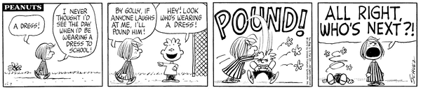 A DRESS! I NEVER THOUGHT I'D SEE THE DAY WHEN I'D BE WEARING A DRESS TO SCHOOL! ドレスだって! 学校にドレスを着ていく日が来るなんて、夢にも思わなかったよ! BY GOLLY, IF ANYONE LAUGHS AT ME, I'LL POUND HIM! 全くもう、もし誰かがあたしを笑ったら、ぶっ飛ばしてやるから! HEY! LOOK WHO'S WEARING A DRESS! へぇ! 見ろよ、誰かさんがドレスを着てるぞ! POUND! (ボコッ!) ALL RIGHT, WHO'S NEXT?! よし、次は誰だい?!