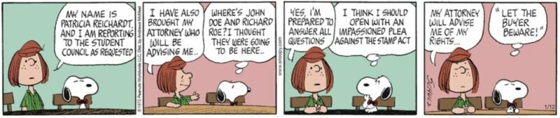 MY NAME IS PATRICIA REICHARDT, AND I AM REPORTING TO THE STUDENT COUNCIL AS REQUESTED あたしの名前はパトリシア・ライハルト。要請通り、生徒会に出頭したよ。 I HAVE ALSO BROUGHT MY ATTORNEY WHO WILL BE ADVISING ME.. 助言をくれる弁護士も連れてきた。 WHERE'S JOHN DOE AND RICHARD ROE? I THOUGHT THEY WERE GOING TO BE HERE.. ジョン・ドゥとリチャード・ローはどこだい? 彼らもここに来ると思ってたのに.. YES, I'M PREPARED TO ANSWER ALL QUESTIONS ああ、どんな質問にも答える準備はできてる。 I THINK I SHOULD OPEN WITH AN IMPASSIONED PLEA AGAINST THE STAMP ACT まずは「印紙法」に対する熱烈な反対陳述から始めるべきかな。 MY ATTORNEY WILL ADVISE ME OF MY RIGHTS... 弁護士があたしの権利について助言してくれるはずだよ... "LET THE BUYER BEWARE!" 「買い手よ、用心せよ(Caveat Emptor)!」