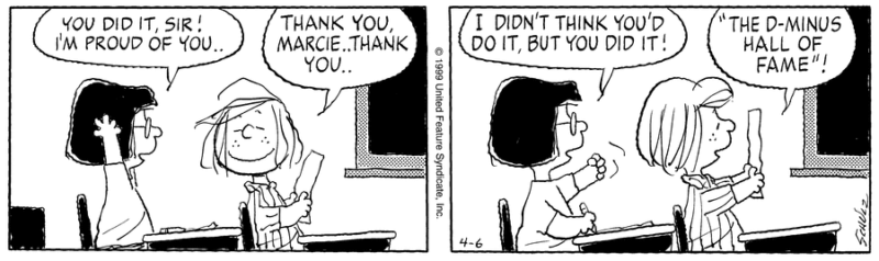 YOU DID IT, SIR! I'M PROUD OF YOU.. やりましたね、閣下(サー)! 誇りに思います.. THANK YOU, MARCIE.. THANK YOU.. ありがとう、マーシー.. ありがとう.. I DIDN'T THINK YOU'D DO IT, BUT YOU DID IT! あなたがやり遂げるとは思いませんでしたが、本当にやりましたね! "THE D-MINUS HALL OF FAME"! 「Dマイナスの殿堂入り」だ!